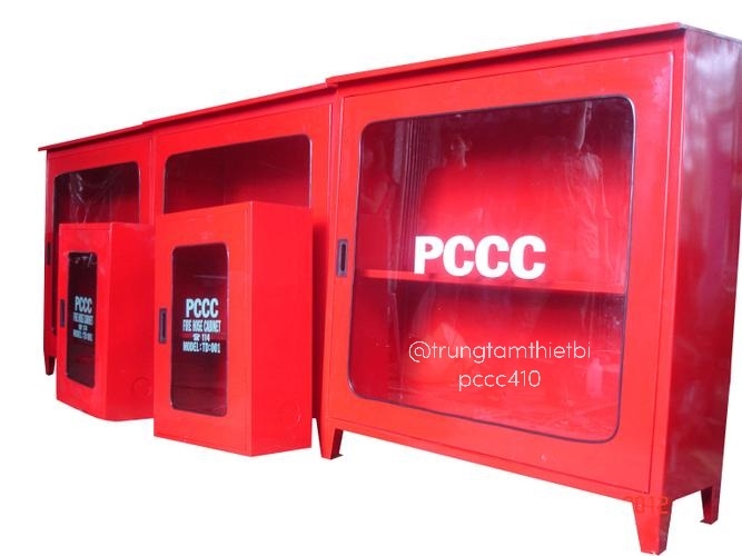 Tủ PCCC sơn tĩnh điện màu đỏ, được làm bằng tôn, inox... có ngăn giữa hoặc không có ngăn, nắp kính nhìn xuyên.